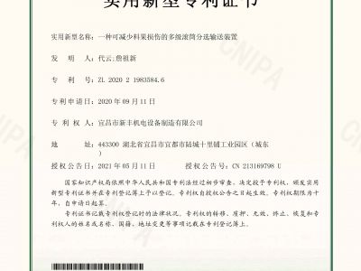 實用新型專利證書《一種可減少料果損傷的多級滾筒分選輸送裝置》